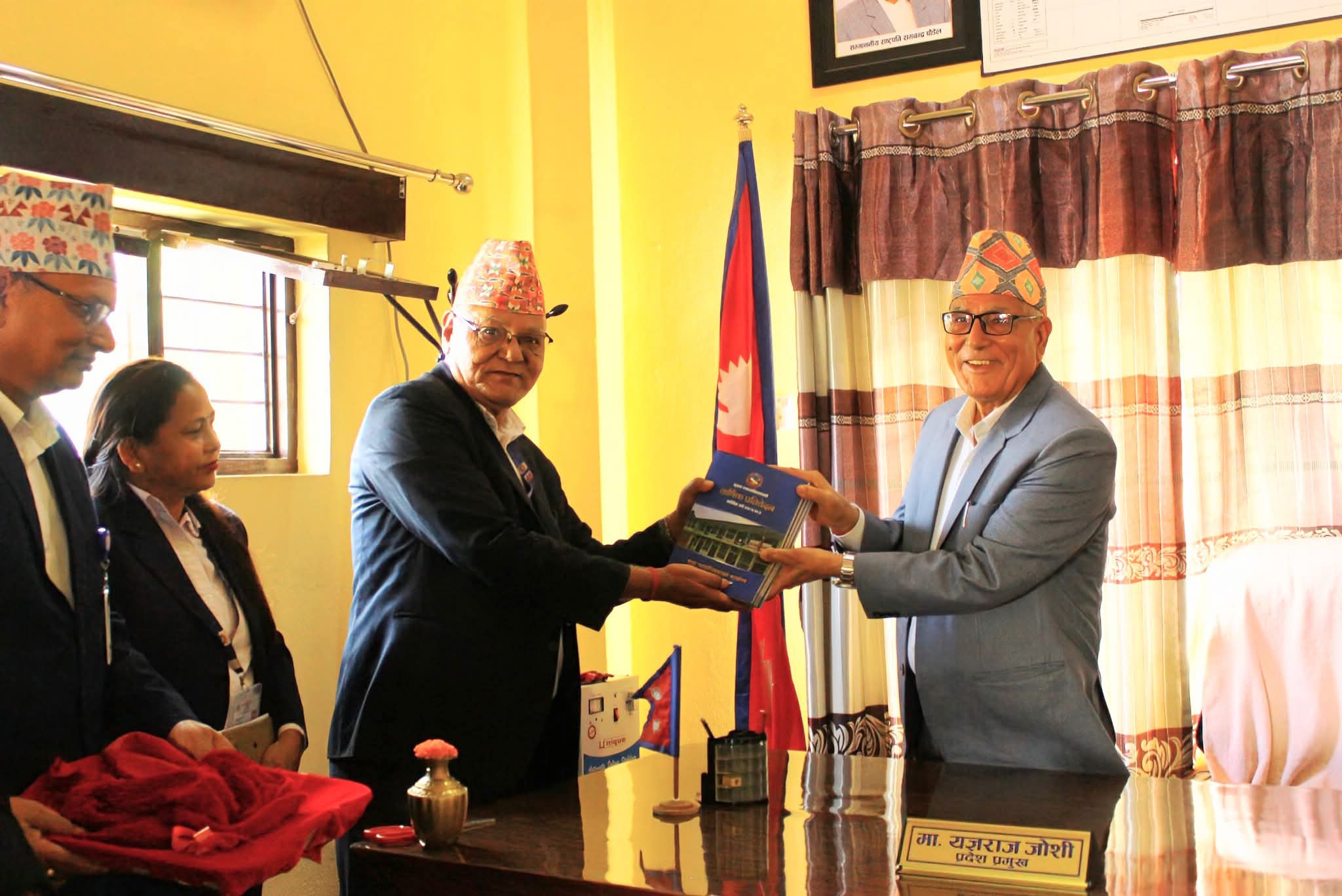 मिति २०८२/०६/२७ गते प्रमुख माननीय श्री यज्ञराज जोशी ज्यू समक्ष मुख्य न्यायाधिवक्ताको कार्यालय, कर्णाली प्रदेश, सुर्खेतको आ.व. २०८१/०८२ को वार्षिक प्रतिवेदन पेश गर्दै गर्दाको तस्वीरहरु