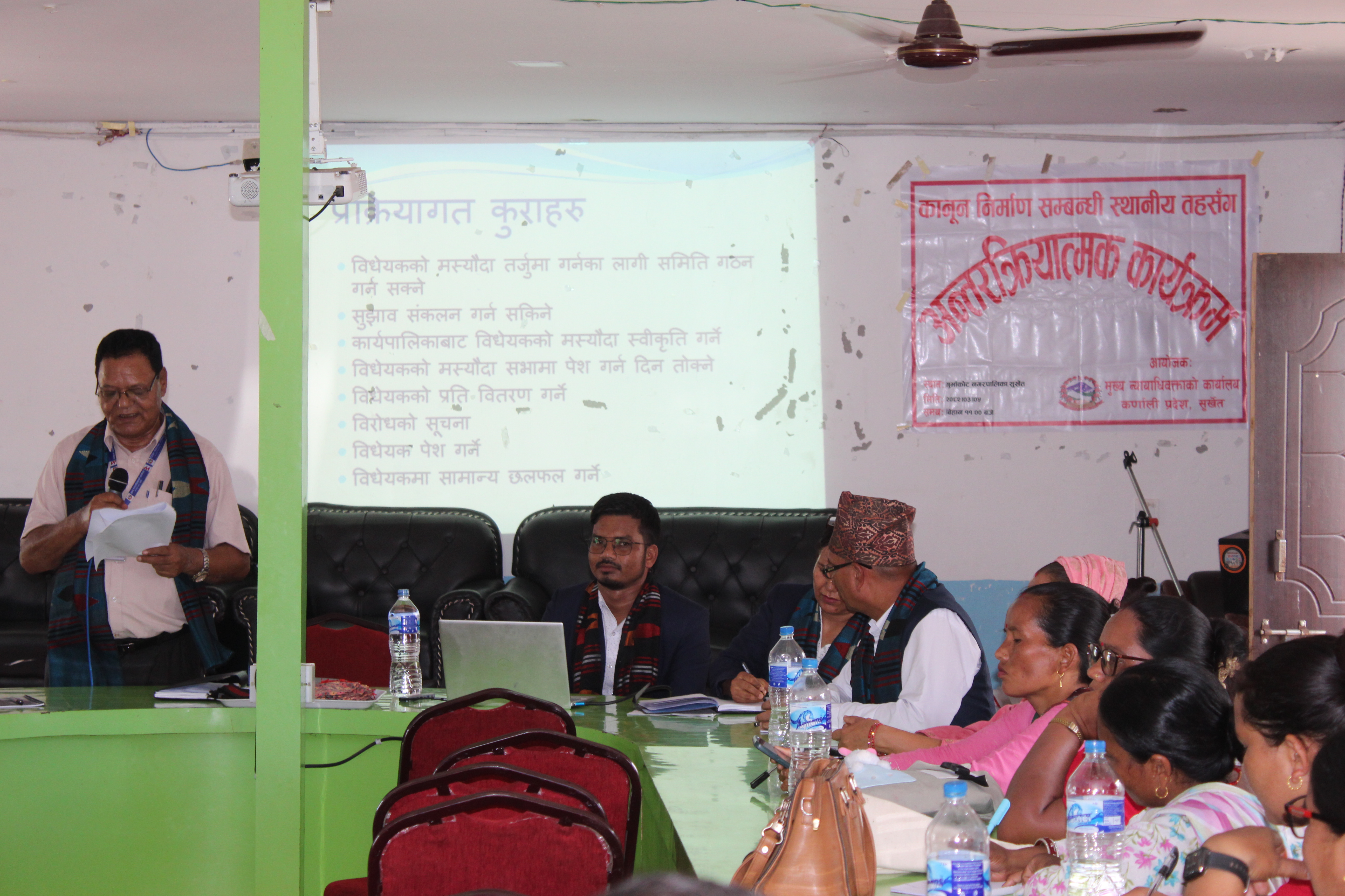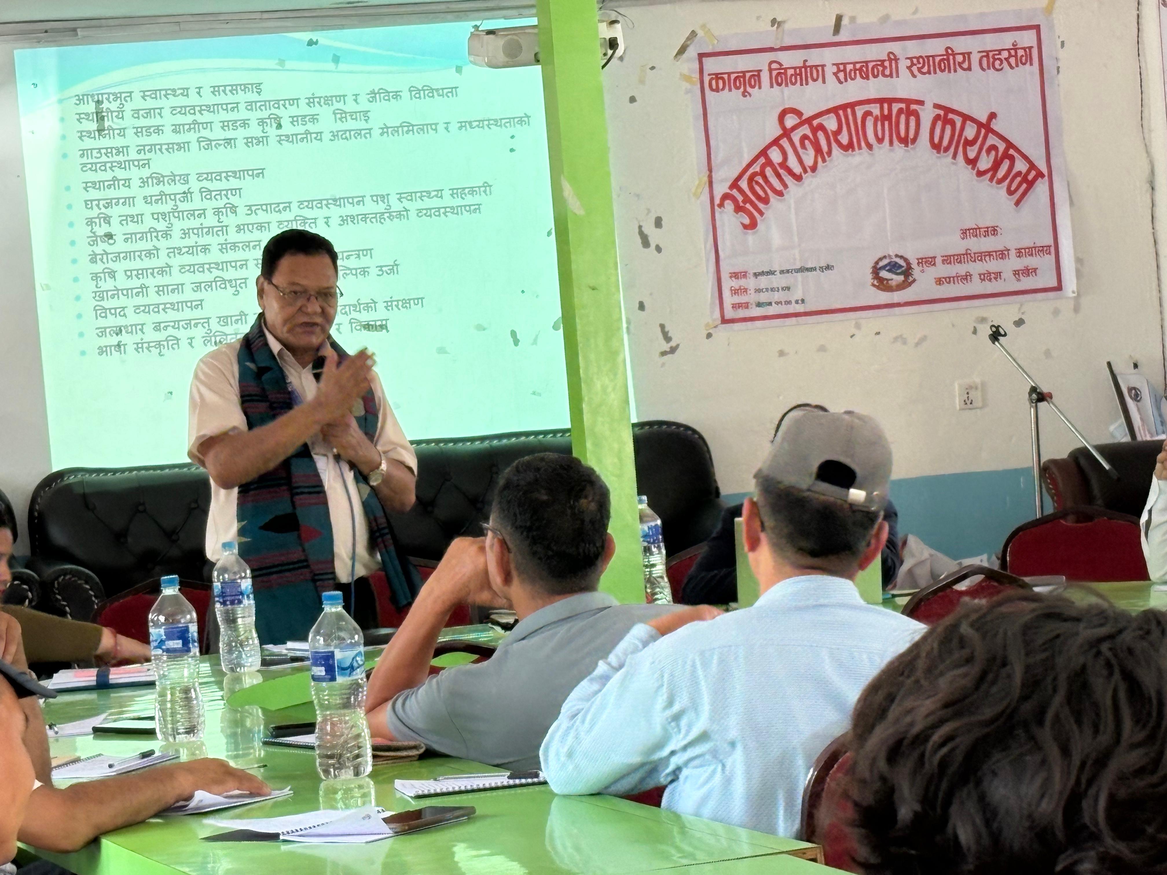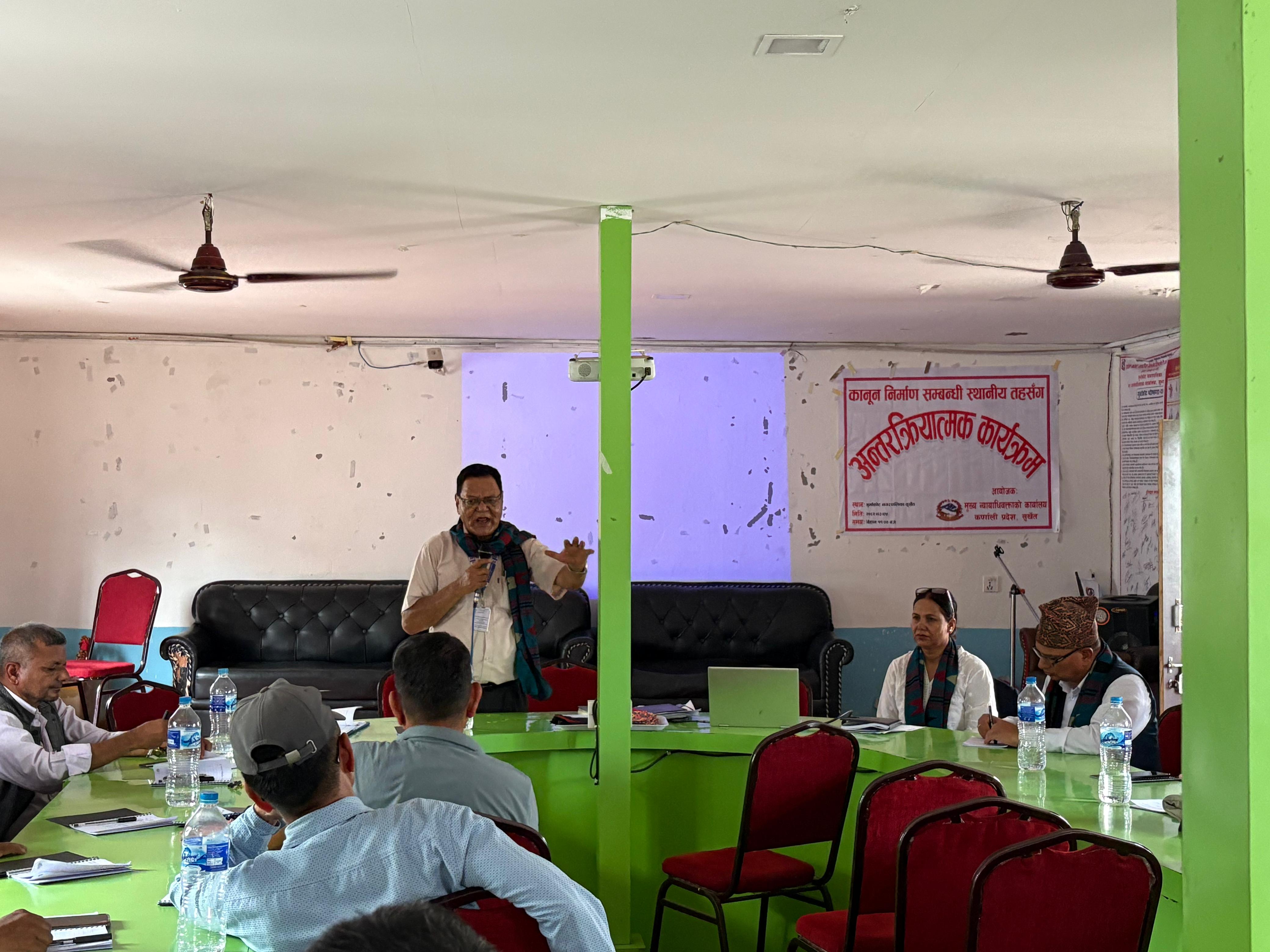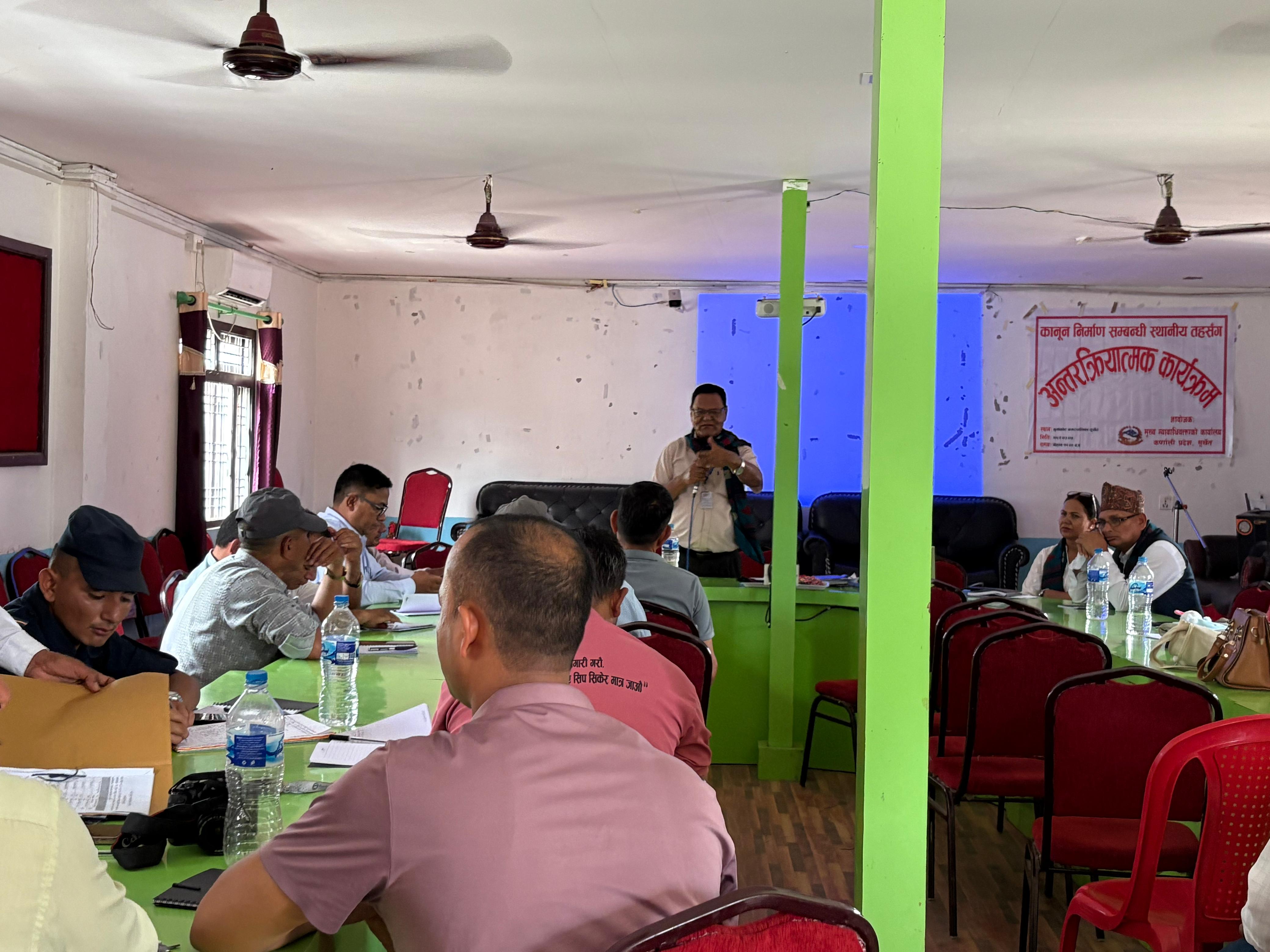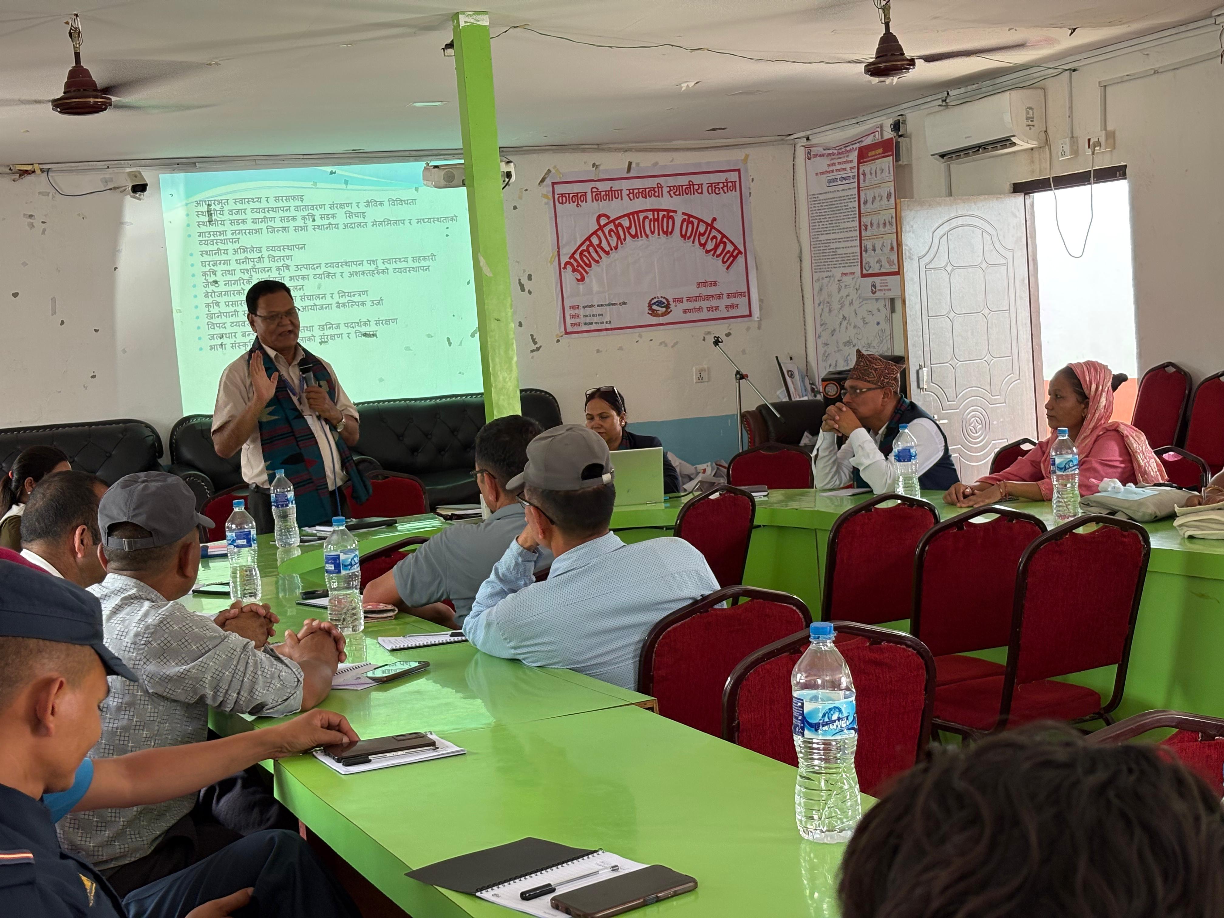 मिति २०८२।०३।०५ गते गुर्भाकोट नगरपालिका, सुर्खेतमा कानून निर्माण सम्बन्धी स्थानीय तहसँग अन्तरक्रिया सम्बन्धी कार्यक्रम सम्पन्न ।