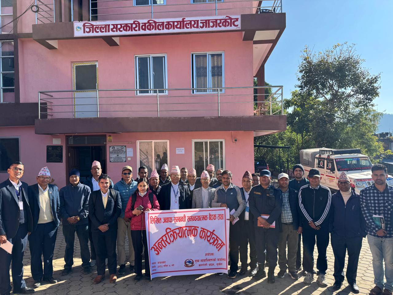 मिति २०८२/०८/०८ र ०९ गते जाजरकोट जिल्लामा रहेका हिरासत र कारागार निरीक्षण र लिखित जवाफ सम्बन्धी समन्वयात्मक बैठक तथा अन्तर्क्रिया कार्यक्रम सम्पन्न ।।